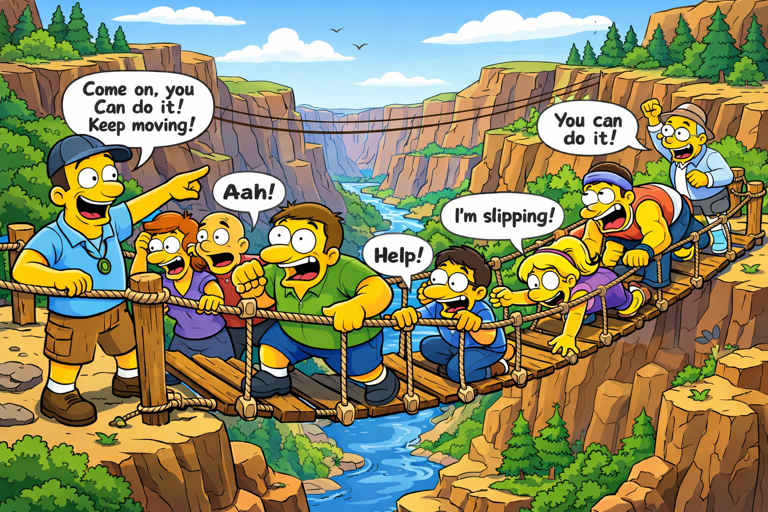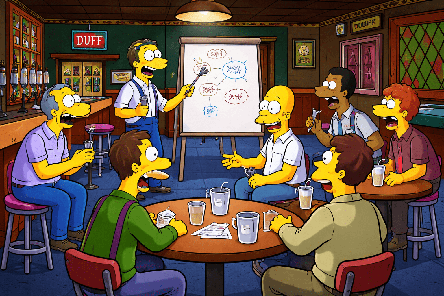 What better way to build psychological safety than in a bar where literally no one judges you? Teams participate in structured communication exercises while seated at Moe’s legendary sticky bar stools. Activities include active listening drills (Barney provides live examples of what NOT to do), “Reading the Room” role-play scenarios inspired by real incidents, and a Duff Beer-fueled brainstorming session. Our facilitators guide teams through the art of difficult conversations using Springfield’s finest residents as cautionary archetypes. Non-alcoholic Flaming Moe’s available upon request.