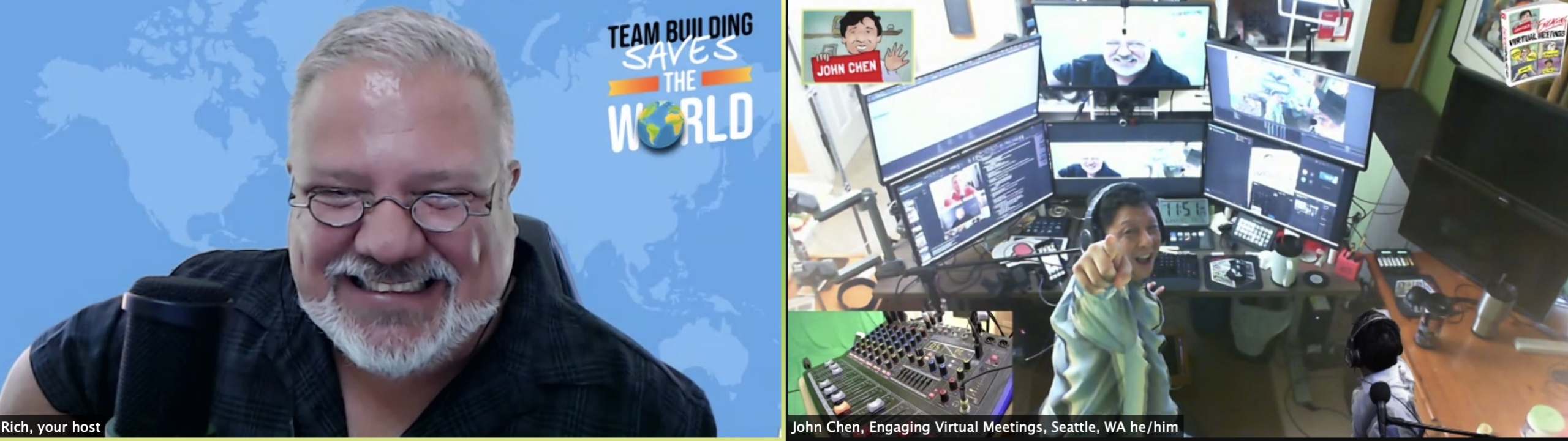 Rich: But first I need to share some love with my supporters at team bonding. If your team is ready to experience teamwork for the power of play, then visit team bonding.com to learn more. Now team join me in welcoming the author of engaging virtual meetings 20 20, 50 digital team building games, 2011. Mr. John Chen.