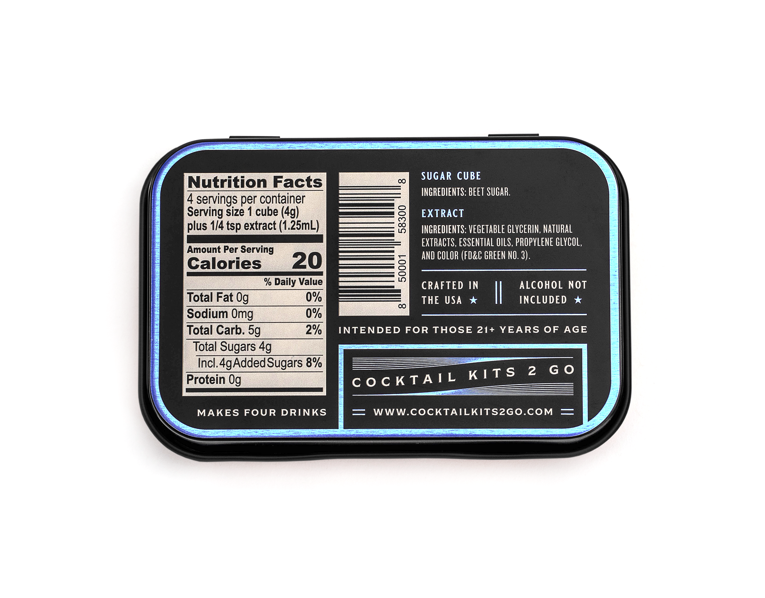 Travel tin includes the premium ingredients and instructions you need to craft four (4) cocktails.