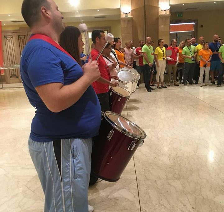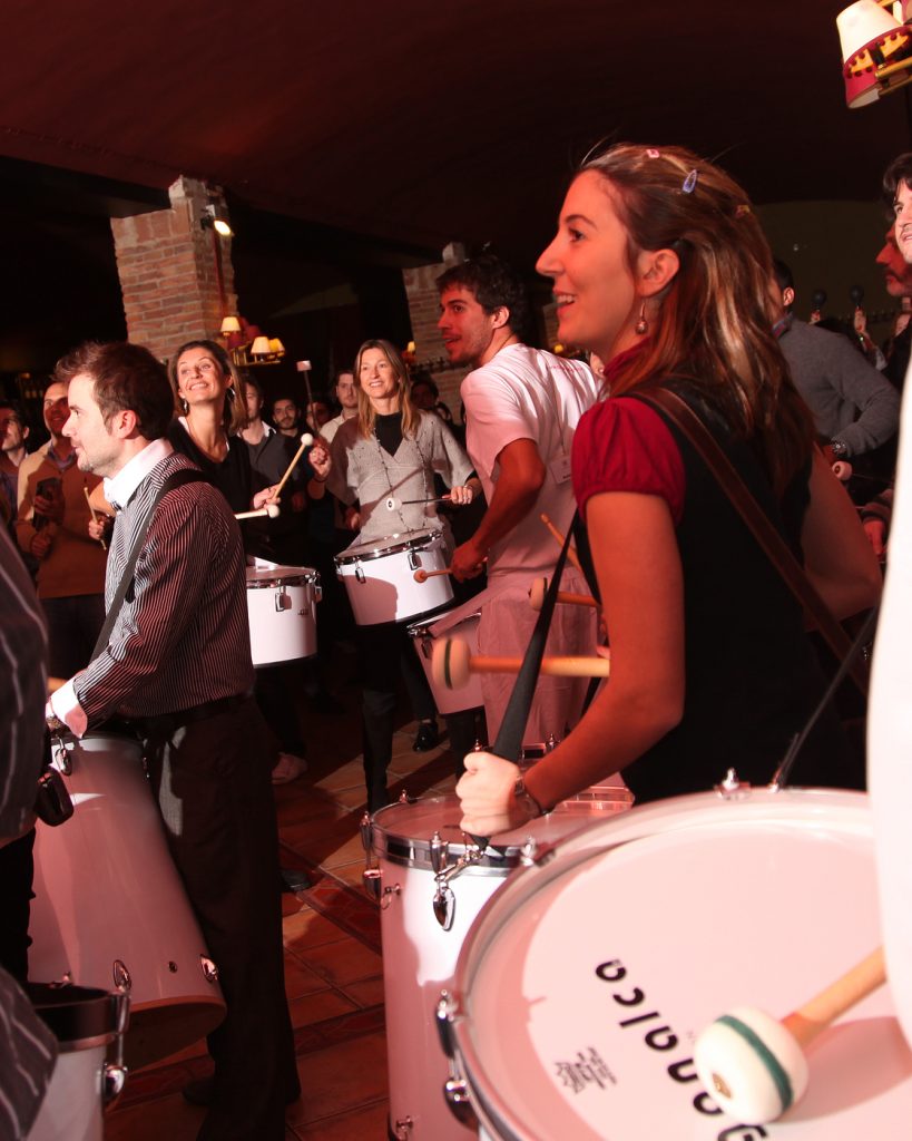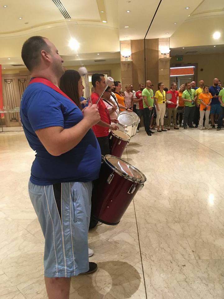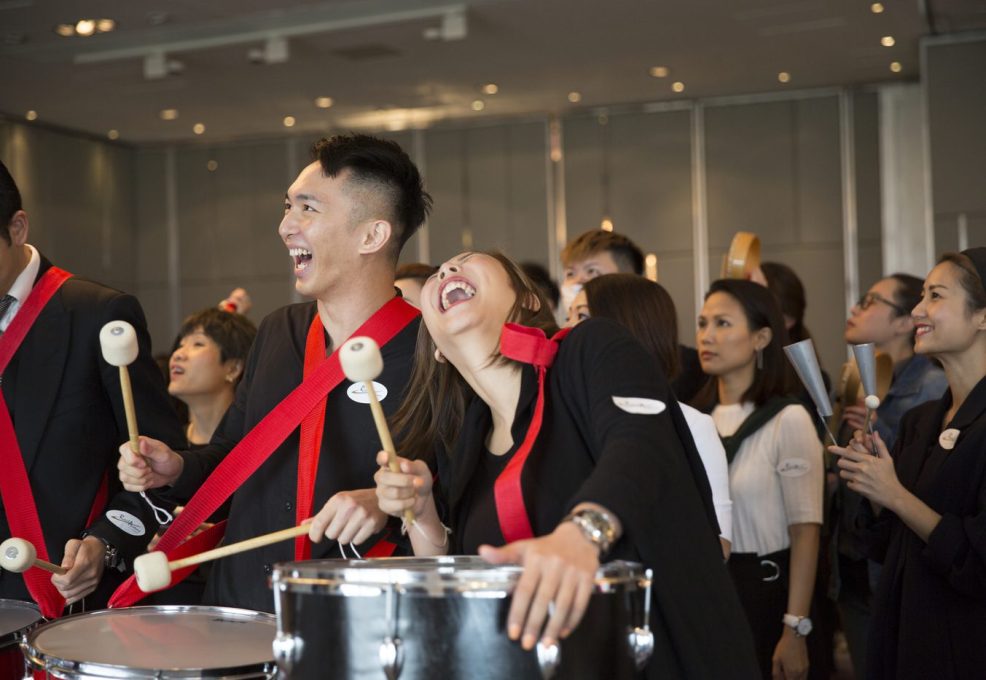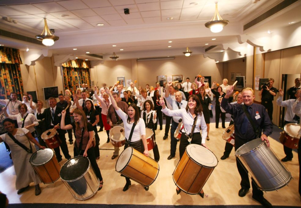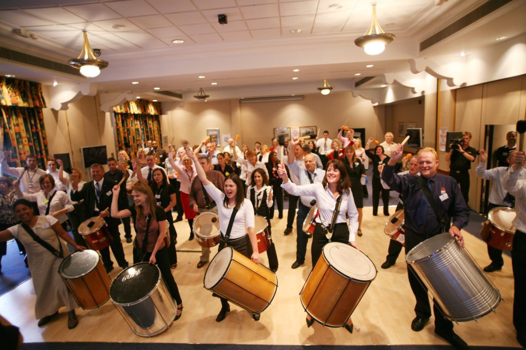 Once they’ve practiced their newfound skills, everybody comes together for a thundering group drum extravaganza. Colleagues beat, shake, stamp and drum in time together in a pulsating display of teamwork. Even shy, reserved personalities emerge from their shells as they get swept up in the social power of room-filling music.