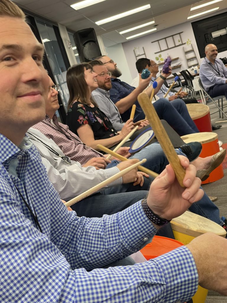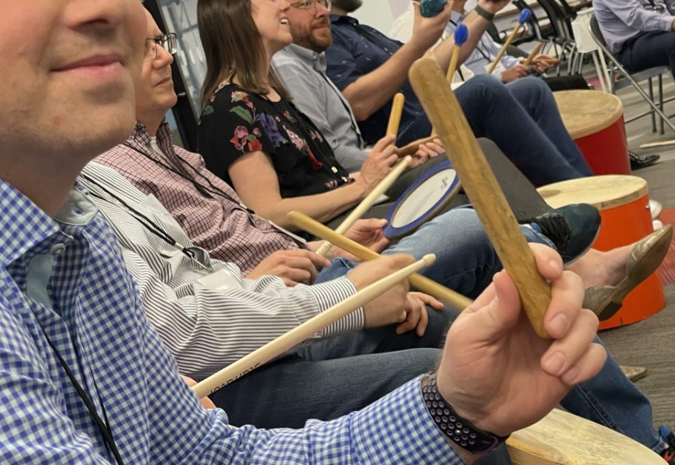 Led by a professional percussionist, your team starts off in small groups, each learning the basics of a different percussion instrument. After a series of rhythm-based warmup exercises, the groups rotate to try a different set of rhythms and instruments. We will rotate enough times to have everyone experience each instrument, and they will choose their favorite for the final performance.