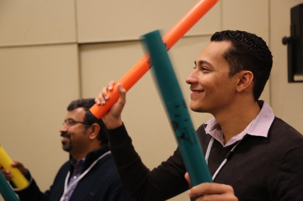 The color of each Boomwhacker signifies which note it plays when hit. A large screen displays color-coded blocks which show people when to hit their instruments. Participants use timing and teamwork to strike their tubes and create musical notes each time a colored block hits a key. As the event progresses, the pace and complexity of the music both become more challenging. Colored blocks move faster and faster, while teams try to keep the rhythm as they build to an uplifting crescendo.