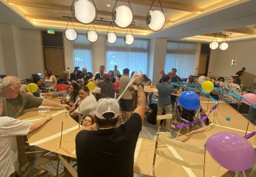 This indoor activity works best in a large, private function room with a good amount of open space. Team tables are optional when space allows. You’ll also want 4 large rectangular tables at the front of the room to hold all the bridge building materials. For groups larger than 50 people, we’ll need a microphone and speaker setup, and strongly suggest a riser for an elevated stage.