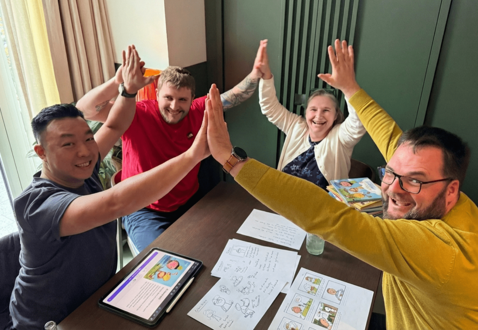 The heart of the experience lies in collaborative storytelling. Using guided prompts and intuitive AI tools, teams write and illustrate an original children’s book, developing characters, themes, and imagery that reflect hope, adventure, and teamwork. The storytelling team building process encourages communication, problem-solving, and plenty of laughter as teams watch their story unfold.