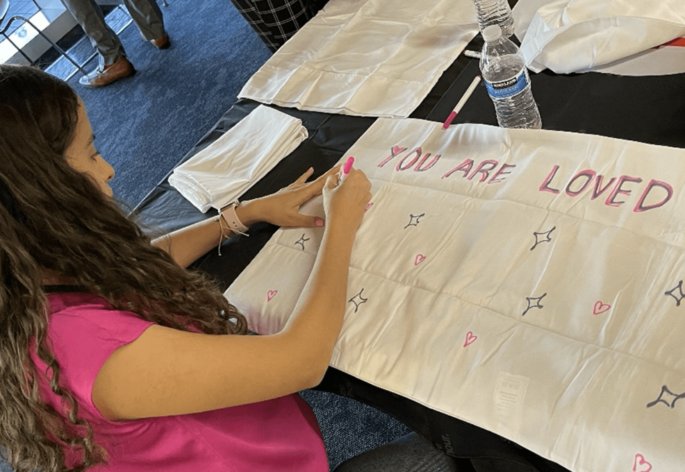 Teams customize vibrant duffel bags, pillowcases, and night lights, transforming practical items into personalized expressions of care. These thoughtful gifts are paired with cozy twin bedding sets to create complete care bags donated directly to local foster children. The duffel bags become symbols of dignity and belonging for youth who often move between homes with little more than plastic bags to hold their belongings.