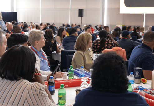 A minimum 15×15 area in front of the room for challenges is needed for participants to come “on stage”. Depending upon group size, a stage or risers may be best for viewing. Participants can be at tables, audience-style seating, or even high cocktail rounds.