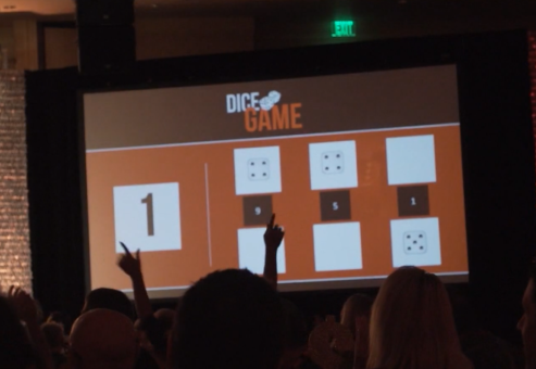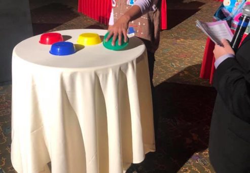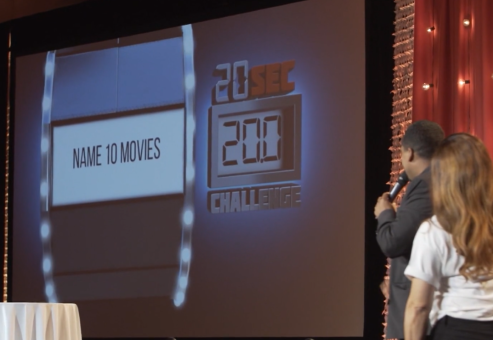 A minimum 15×15 area in front of the room for challenges is needed for participants to come “on stage”. Depending upon group size, a stage or risers may be best for viewing. Participants can be at tables, audience-style seating, or even high cocktail rounds.