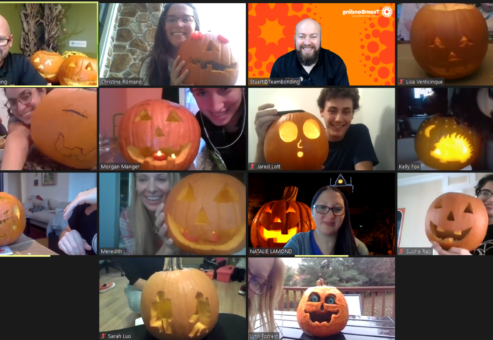 Designs can range from traditional styles to imaginative works of art. Once all the pumpkins are finished, insert the safe candle-style lights (batteries included!) to bring the team’s creations to life. Show them off to your teammates online, then everyone can move their jack-o’-lanterns outside as a show of spooky holiday spirit.