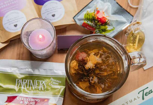 Each guest will receive a tasting box in advance of this team building activity. These boxes come prepared with 3-6 tea options, as well as a tea brewing mug, cookies and notecards. Other tasting box options include savory snacks, calming candles, tea coasters and more. Custom Tasting Boxes are delivered straight to the doorsteps of each participant a few days prior to the event.